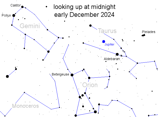 Astronomers call this event "opposition," because Jupiter and the sun are on opposite sides of Earth. The precise moment of closest approach occurs on Dec. 6th, but Jupiter will be extra big and bright all week long. If you're awake at midnight, take a look!