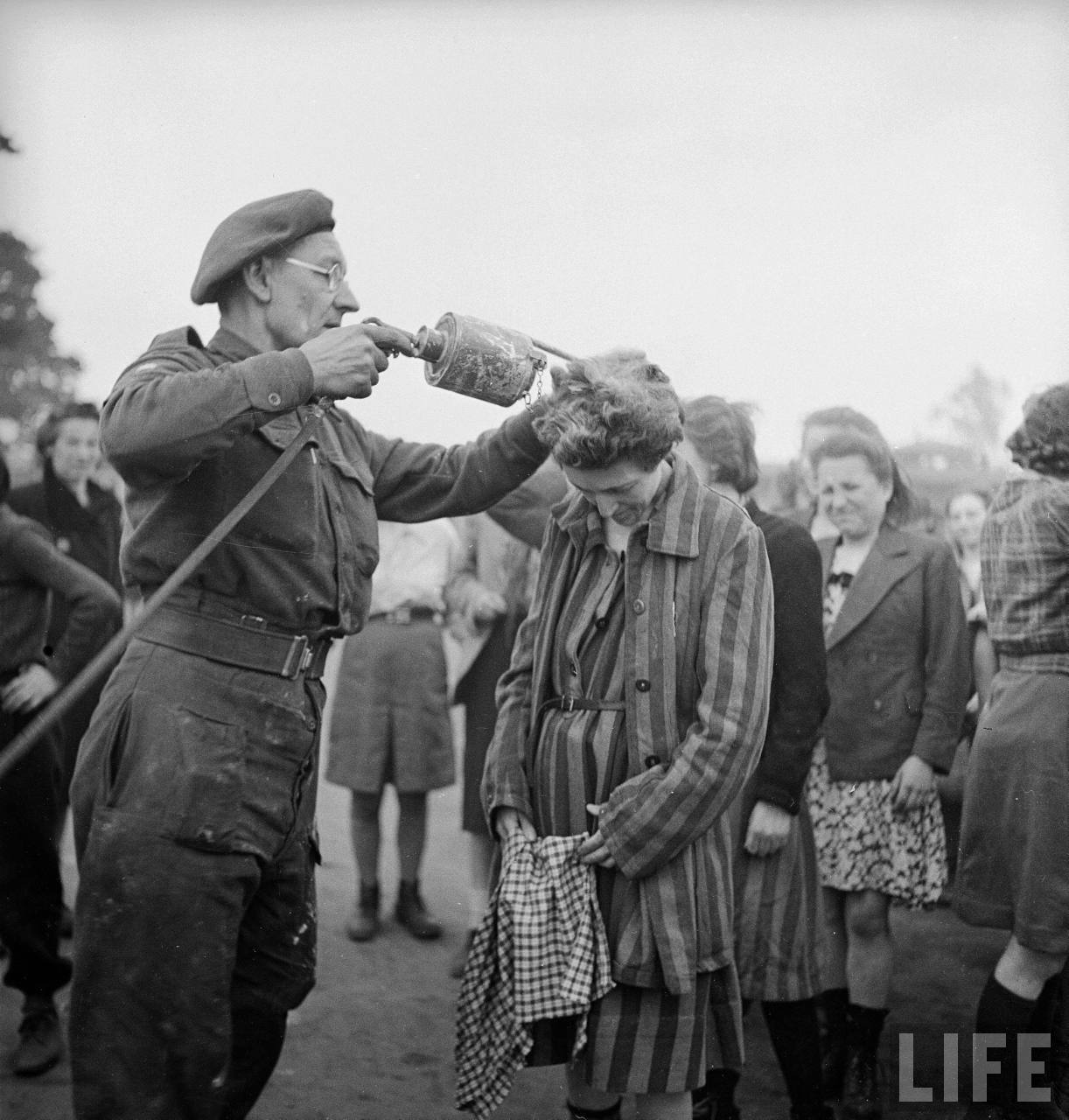 British doctor using DDT! while delousing newly freed female prisoners at the Bergen Belsen concentration camp.
