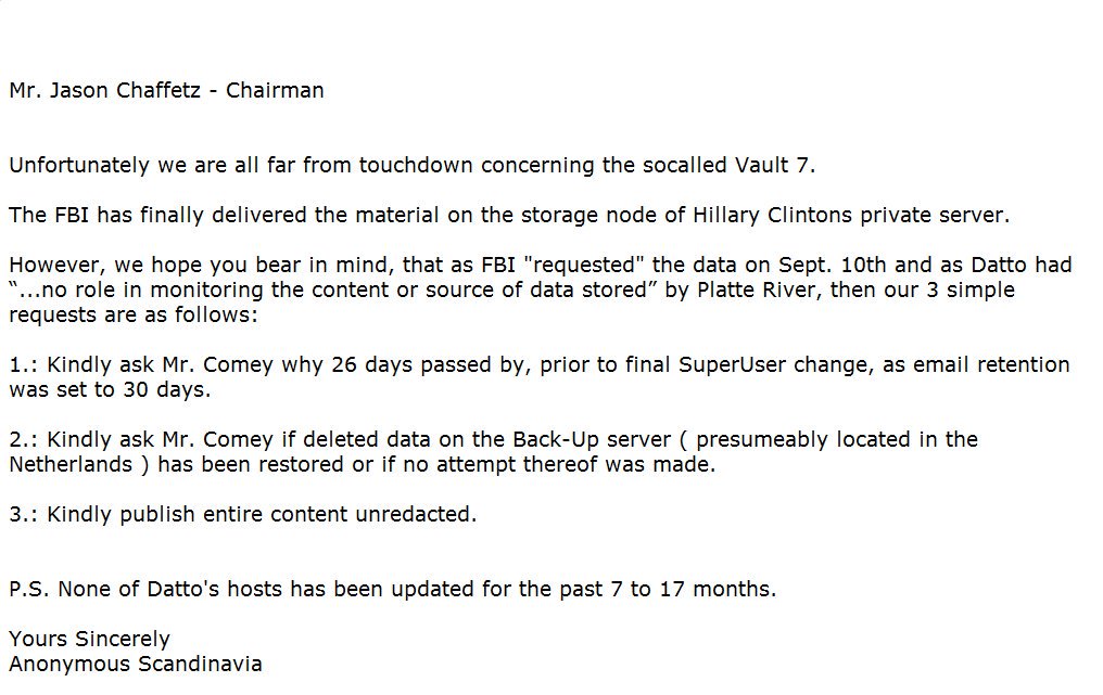 turn in all evidence they have in the Hillary Clinton email investigation makes me strongly believe that Vault 7 is the 650,000 emails and that wikileaks has the and will release them if nothing is done with them. I'm sure there's many holes in my logic and theories here but I'm just giving my observations and opinions. There's lots of 9/11 speculation going on about these tweets but I just don't see it. Especially considering Julian's